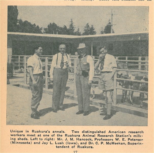 There was a wonderful co-incidence reported and photographed in the book. One of the world’s most influential geneticists, Dr J.L. Lush from Iowa State College was in the New Zealand at the same time as Dr Petersen – and they met at Ruakura. See picture below.