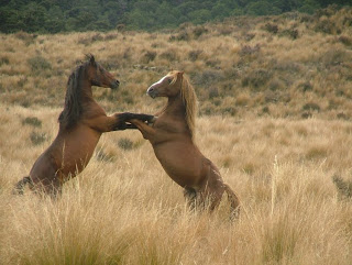 Kaimanawa Wild Horses. Photo copyright Wendy Brewer.Feral herds are the best place to study basic horse behaviour, because there are sufficient numbers of animals and a big enough territory to appreciate the role an individual horse has in the herd hierarchy. So many problems of individual horses isolated from their kind is because owners forget horses are social animals.