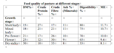 The table below shows how feeding value of pasture at different stages of growth changes over time