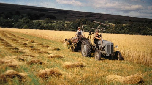 A funny thing is that we never saw a new binder – they were like family heirlooms and had passed from owner to owner at farm sales up and doon the valley. A Mr McCormack invented the self-tying binder in 1878 and some of the North Tyne and Rede models looked contemporaries of his original! By our day they had all been fitted with a tractor towbar although a few folk still yoked a pair of horses. They were not an easy drag for horses.