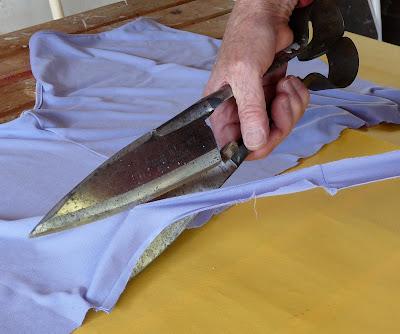 You needed a pair of large and sharp scissors to do this, but the tool of choice, if you had a shepherd friend was to borrow a pair of old sheep shears. With these you could slice through the cloth with a long straight cut – as long as they were sharp.