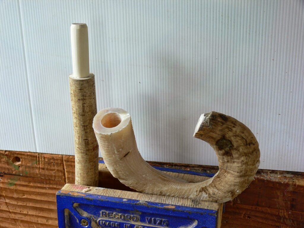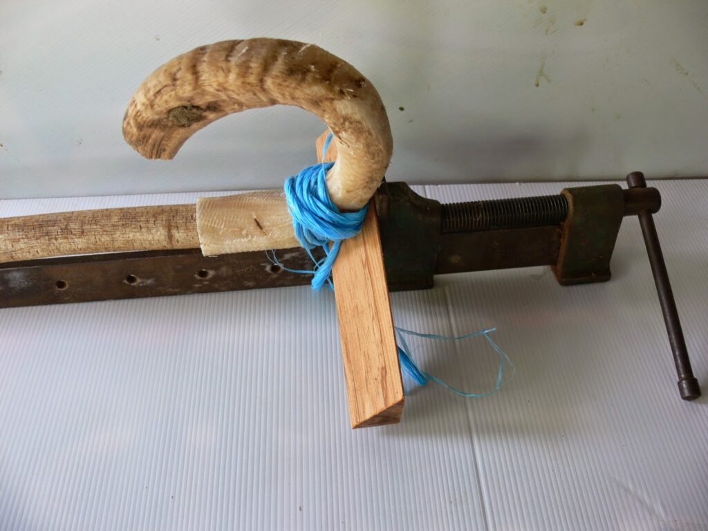 Hold the horn firmly in the vice to bore the hole for the shank spigot. Make sure the brace is perpendicular.
