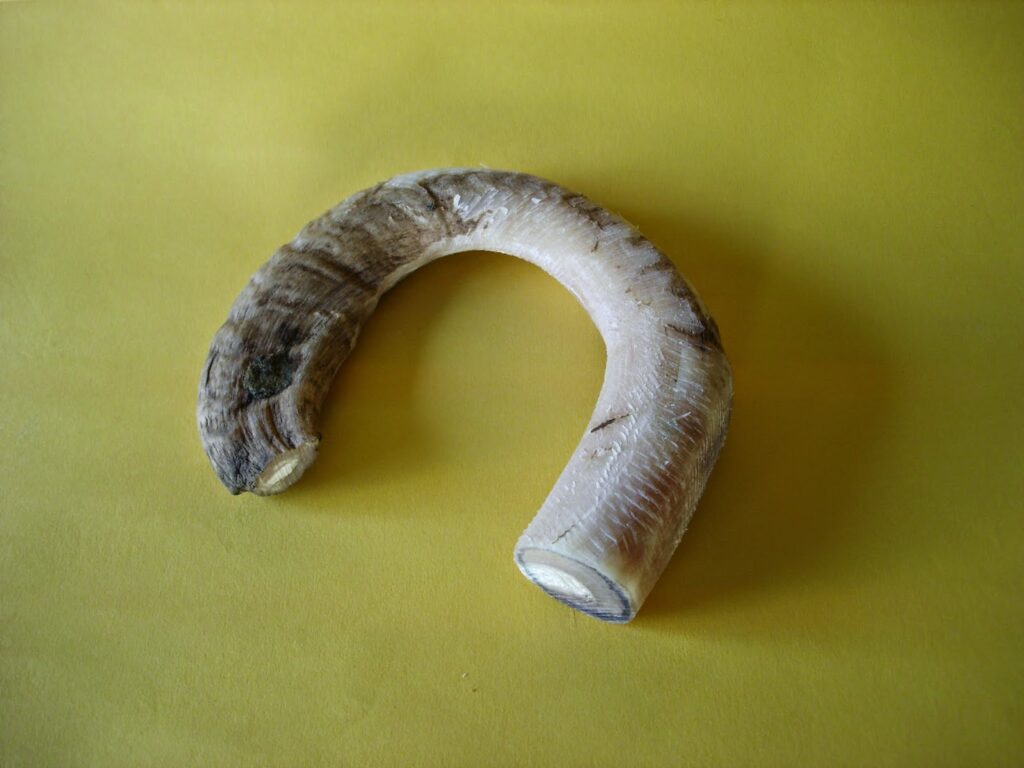 The horn as cut from the ram’s head. Note the bone core which is part of the skull and which falls out on boiling. You can’t use that bit
