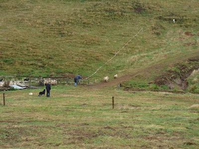 The start is always with the dog kept back off the sheep and barking until the handler sees which direction they are going to take. After this, the handler will start to direct the dog to move and direct the sheep straight up the slope. This is not their preferred route as they would rather move off to right or left along the many sheep tracks on a steep slope which is their normal way of grazing hills.