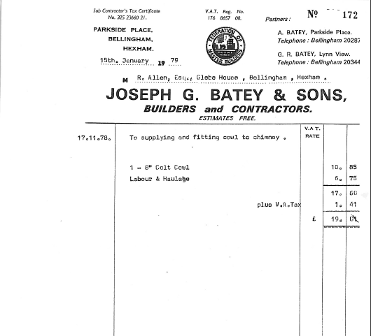 Graham was the last partner in the business along with his Uncle Arthur when he must have received an order from Robert Allen to fix a cowl on the chimney at Glebe house in Bellingham. Their bill head states ‘Estimates Free’ so presumably Robert had enjoyed that part of the deal!
