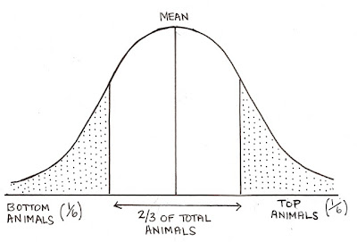 - If you draw a line down from the shoulders of the curve to the base where it changes direction, you’ll see that two thirds of the individuals will be in that area around the average, one sixth will be in the bottom end on the left, and sadly only one sixth will be in the “top” animals on the right.